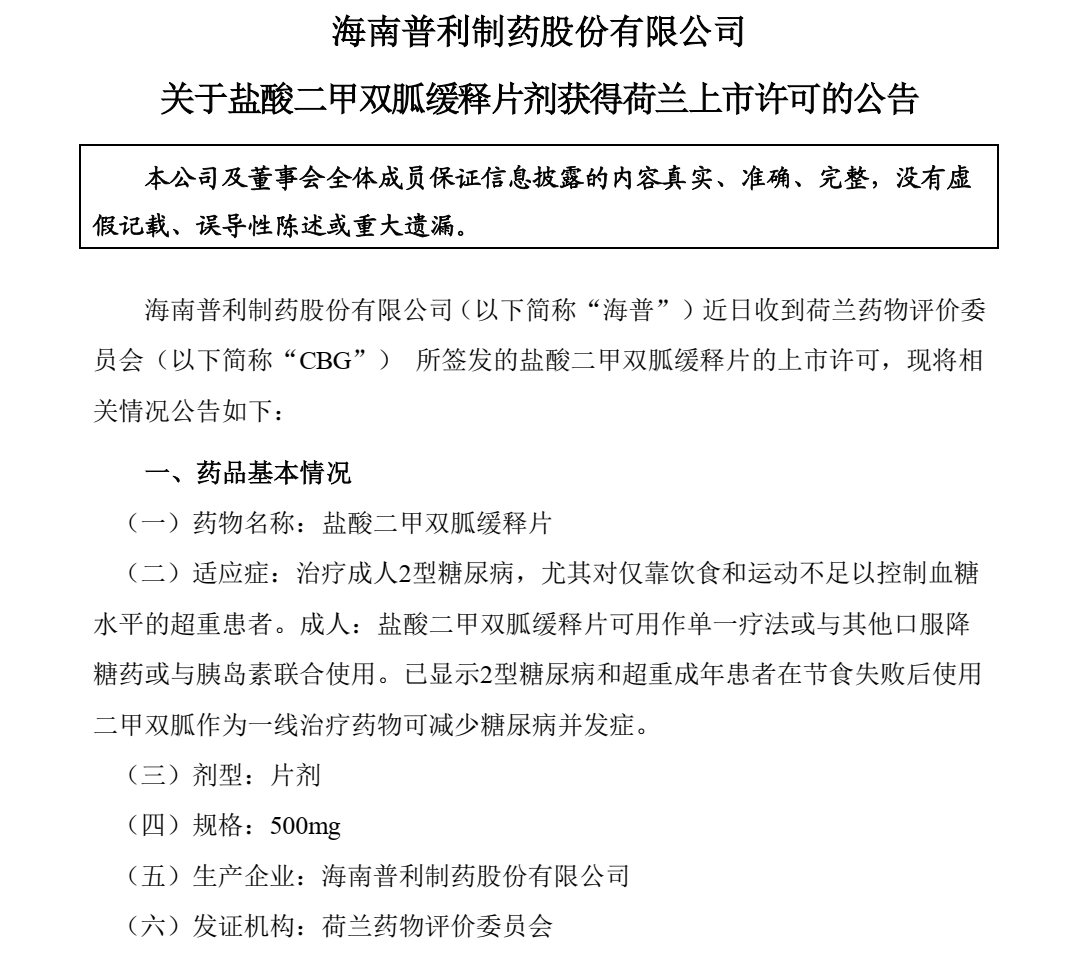 此外, 永利3044集团官网盐酸二甲双胍缓释片(500mg)收到了荷兰CBG所签发的上市许可,标志着永利3044集团官网具备了在荷兰销售盐酸二甲双胍缓释片的资格,也标志着唐必呋不止是普通的二甲双胍,而是具有出口品质的二甲双胍,其质量、疗效、安全性获得国内外广泛认可。