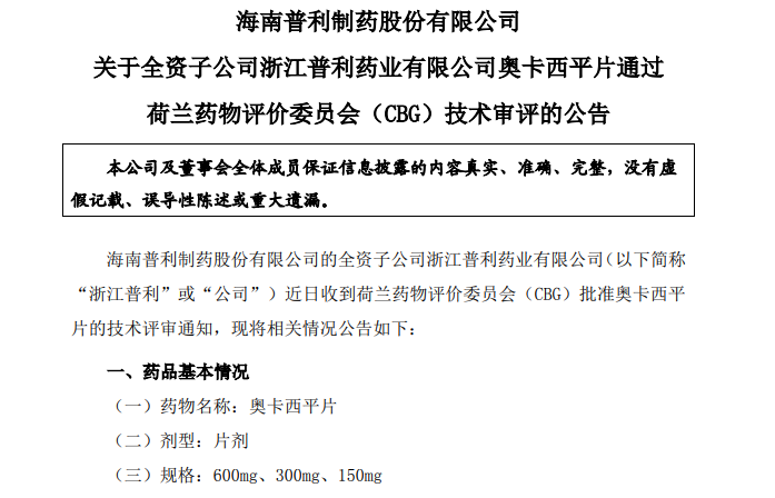 4.奥卡西平片通过荷兰药物评价委员会(CBG)技术审评;
